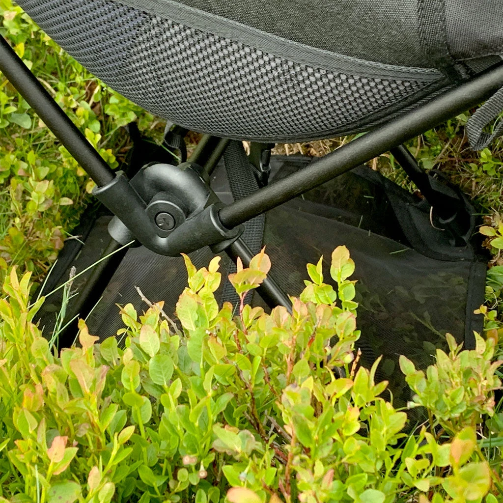 Stolen er svært kompakt og lett i vekt når den er sammenpakket i den medfølgende pakkeposen, og veier bare rett over en kilo… noe man virkelig setter pris på når hvert gram teller i tursekken. Det er likevel i konstruksjonen at denne stolen virkelig skiller seg ut. Stolbena hviler på en truge som stabiliserer turstolen og samtidig gjør det lett å sitte på myke underlag. Stoffet er laget i et lett men slitesterkt 600D Nylon som både virker pustende og bidrar til lettere vekt, sammen med hardvaren i Aluminium. Den har i tillegg en praktisk koppholder på høyre side, og to oppbevaringslommer for verdisaker, mobiltelefon eller andre småting.