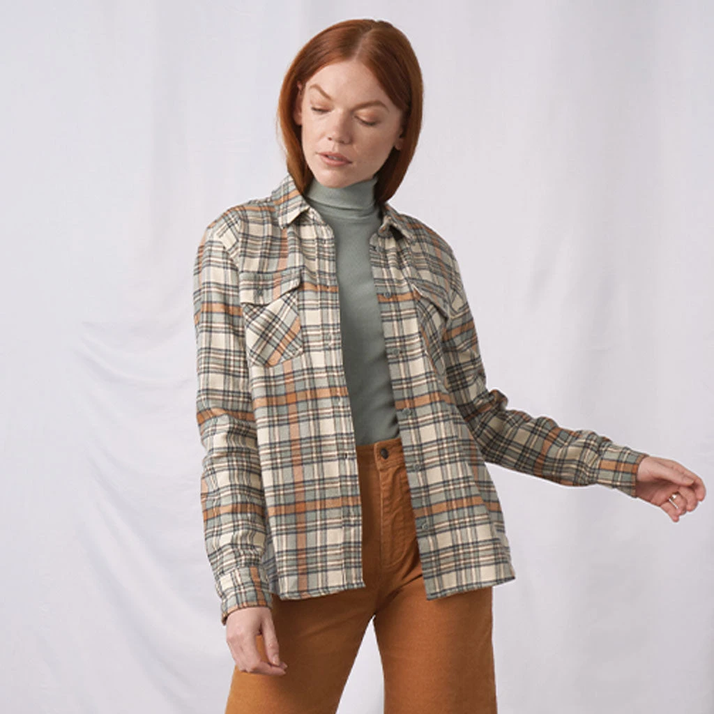 Denne flanellskjorten har et klassisk og tidløst design, med lett buet nedekant, spiss krage, knapper langs hele midten, to brystkommer med knapper og knapper i ermene. Passformen er lett innsvingt, typisk for en dame-utgave. Stoffet er laget i en blanding av 60% bomull og 40% resirkulert polyester. Dette er en materialblanding som føles myk og varm, samtidig som at den generelt gir skjorten en ekstra dimensjon av holdbarhet og slitestyrke.